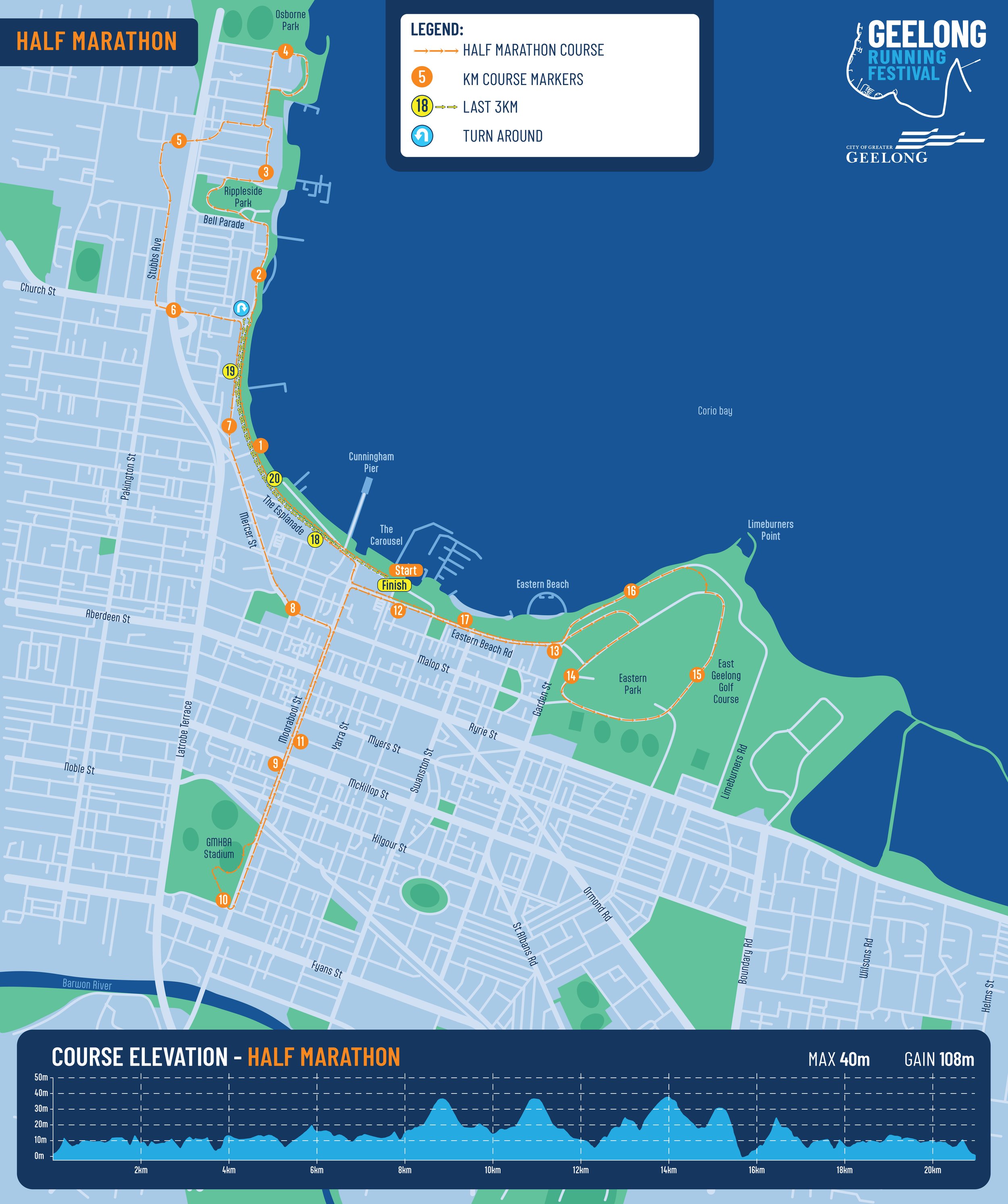 The opportunity to run or walk around the streets of Geelong traffic free, pass through iconic Kardinia Park, and to enjoy the picturesque views of Corio Bay and the Eastern Beach foreshore.